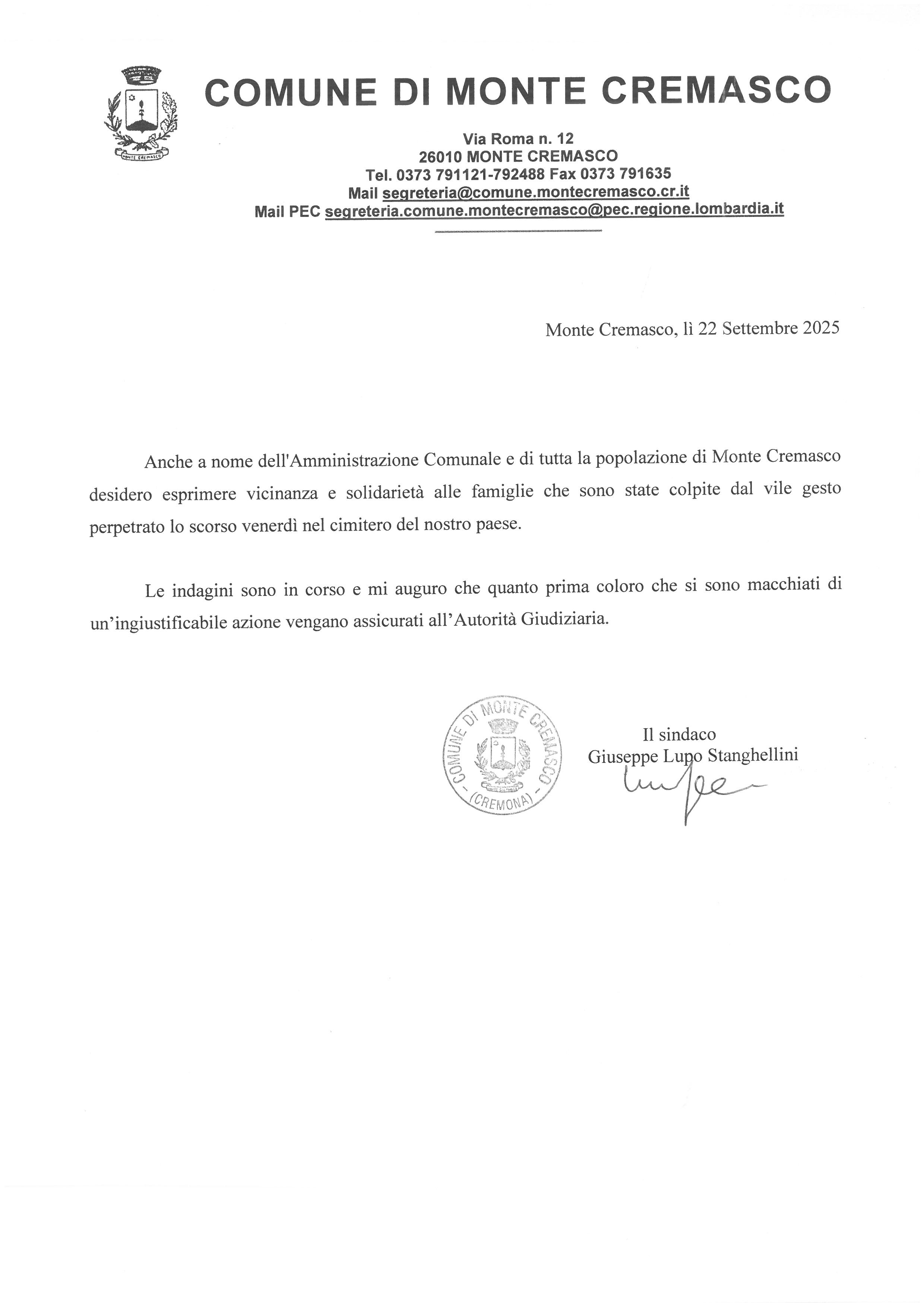Anche a nome dell'Amministrazione Comunale e di tutta la popolazione di Monte Cremasco desidero esprimere vicinanza e solidarietà alle famiglie cjhe sono state colpite dal vile gesto perpetrato lo scorso venerdì nel cimitero del nostro paese.